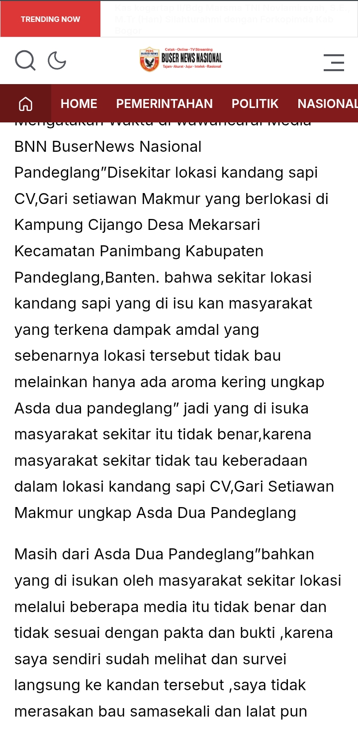 ” … Asisten Daerah Tingkat Dua Pandeglang Mengatakan Waktu di wawancarai Media BNN BuserNews Nasional Pandeglang” Disekitar lokasi kandang sapi CV,Gari setiawan Makmur yang berlokasi di Kampung Cijango Desa Mekarsari Kecamatan Panimbang Kabupaten Pandeglang, Banten. bahwa sekitar lokasi kandang sapi yang di isu kan masyarakat yang terkena dampak amdal yang sebenarnya lokasi tersebut tidak bau melainkan hanya ada aroma kering ungkap Asda dua pandeglang” jadi yang di isuka masyarakat sekitar itu tidak benar,karena masyarakat sekitar tidak tau keberadaan dalam lokasi kandang sapi CV,Gari Setiawan Makmur ungkap Asda Dua Pandeglang